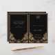Un élégant programme de mariage de style vintage ou une commande de service avec un thème "The Great Gatsby" des années 1920 dans les tons noir et or. Un arrière - plan noir met en valeur la bordure géométrique complexe de style Art Déco dans les tons beiges dorés. Les monogrammes de Bride et Groom sont mis en surbrillance à l'aide d'une police de couleur gris argenté contrastée. Ce magnifique programme de mariage est conçu pour être plié le long du centre pour créer un programme bi-pli de type carte.