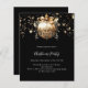 An invitation for a Christmas Party. A black background. Decorated with a large gold vintage looking bauble and golden stars. Personalize and add the details. White text.