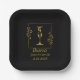 Elegant square paper plate features gold hand-drawn botanical frame with botanical letter I in centre on black background. Personalize with couple's name, date or other message.