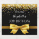 Elegant, classic, glamourous birthday label. Faux gold coloured bow and confetti. Black background. Personalize and add the date, name and age/event.