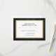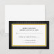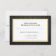 This RSVP features a professional black and grey vertical stripe background with a white box with a gold border in the centre. Customizable text allows you to add your response information.