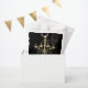This design features elegant black background with a vintage golden colour chandelier. The damask gold chandelier reflects its shadow contrasting against the black. The combination of the black and gold colours creates a sophisticated, trendy and chic style. Elegant wedding favour bag design with modern elements. The simple setup of the typography gives it a distinct style. Matching wedding invitations and other stationery items are also available.