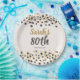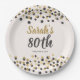 Elegant black and gold confetti glitter women's 80th birthday party paper plates personalized with a name, party date, and age. All text is customizable so these plates can be designed for any age when you use Zazzle's design tools. Contact me for assistance with your customizations or to request additional matching or coordinating Zazzle products for your party.