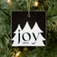 Modern festive black, white and gold confetti ornament. Our design features a modern black and gold confetti background with a fun white Christmas tree design. "Joy" is displayed along with the year. The reverse side features a place to add your own family photo along with your name. Design by Moodthology Papery