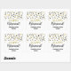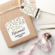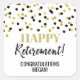 Happy retirement favour tag sticker with black and gold confetti pattern.