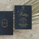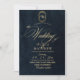 Elegant stylish blue and gold modern wedding invitation with an elegant handwritten font with curls and a monogram of the bride and groom. Classy and elegant, simple and modern invitation.