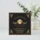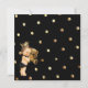 Chic baby boy shower invites in black and gold with touches of Art Deco style- Elegant faux gold metal look scrolls decorate the corners. Centred is a gold metallic effect decorative circle frame and leaf scrolls with a handsome little prince wearing a gold crown, black diaper, slippers, and bow tie, and holding his favourite teddy bear. Below is the mother's name and custom details in gold hued lettering, including RSVP details. Faux gold glitter border accents. Back has black background with gold metallic look polka dots and matching little prince in the lower corner. In sophisticated black and gold. Note: All images are printed. Not actual glitter or metal.