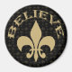 Keep hope on your fridge with this Black and Gold Fleur de Lis Believe magnet! The magnet features a gold Fleur de Lis under the word "Believe" on a black background covered with small Fleur de Lis symbols.