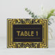 These table numbers feature an intricate geometric frame, geometric patterns, a black and gold colour palette, and other stylistic details all inspired by Art Deco and the roaring twenties. You can customize the sample text fields to your liking.