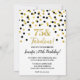 Custom 75th Birthday party invitations in black and gold glitter confetti pattern. Add your name and party details for a unique and stylish 75 and fabulous party invitation.
