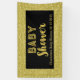 Custom name gender neutral baby shower sign with glittery gold print pattern and vintage style handwritten lettering. A perfect personal touch for your baby shower.