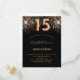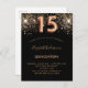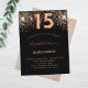 A modern, stylish and glamourous invitation for a girl's Quinceañera, 15th birthday party. A black background decorated with faux glitter. The name is written with a modern golden coloured hand lettered style script. Personalize and add your party details. Number 15 is written with a balloon style font, script.