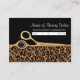 Remind clients and customers with these fashionable hair salon appointment reminder business cards for a professional hairstylist with modern and trendy brown leopard fur pattern and a pair of chic gold hair cutting scissors. Each individual elegant and stylish dual purpose business card can be personalized by writing in by hand the name of the beautician or hairdresser and salon appointment info. Flat printed image, not metallic or fur.