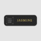 A simple custom icon business name tag template in a modern minimalist style on a sleek black background with gold text. The versatile template can easily be updated with your company logo, graphic or photo, name, title.