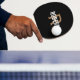 Modern ping pong paddle with an elegant black background, a modern golden monogram and a white typography name. Personalize with your name and monogram.