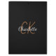 A classic black background. Personalize and add a name and monogram initials. The name is written with a modern hand lettered style script. White and golden letters.