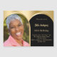 Add your own vertical size photo. An arch shaped photo frame. A black and faux gold background colour. Personalize and add a name and party details.