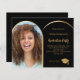 Add your own vertical size photo of the graduate. A faux gold arch shaped photo frame. A classic black background colour. Personalize and add a name and party details.