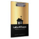 This custom, promotional real estate company clipboard is a terrifically stylish way to showcase yourself to your clients. A simple, black graphic modern house icon and bold white typography on a black band overlay a faux gold foil background. Personalize with your name and company plus phone number, website or other copy. The 9”x12.5” size holds up to .5” of paper securely. Makes a chic, professional and elegant statement as an unique leave-behind promotion for your clients.