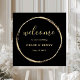 This wedding welcome sign features a faux gold circle frame and modern calligraphy with a black background.