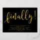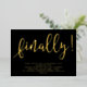 A simple typographic engagement party invitation. This design features the word "finally!" in bold gold foil hand lettered font and party details in modern sans serif font, all on a black background.