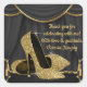 Womans black and gold high heel shoes birthday party favour stickers with beautiful gold glitter high heel shoes on a black and gold curtain background. This elegant black and gold birthday party sticker is easily customized for your party or event by adding your text.