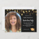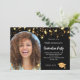 Add your own vertical size photo of the graduate. An arch shaped photo frame. A classic black background colour, decorated with faux gold stars. Personalize and add a name and party details.