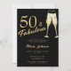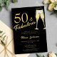 Modern faux gold trendy calligraphy script 50 and fabulous years black birthday party invitation with champagne flutes.