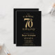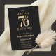 The invitation features a striking black and gold color palette which provides a luxury look. A sophisticated blend of the custom Surprise 70th Typography with the Handscript "Birthday Party" carries a vibe of "Classic Glamour," conveying that the event will be a formal yet joyous occasion.