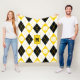 This sporty volleyball team colours fleece blanket features a black, gold and white argyle plaid pattern with gold "stitching" extending diagonally across the diamond shapes and white volleyballs overlying the gold diamond shapes - customize with athlete's monogram - by katz_d_zynes