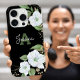 A chic, stunning, sophisticated, white and faux gold glitter floral watercolor with personalized script typography and a san serif type monogram initial overlay a dramatic black background on this chic, elegant, modern cell phone case. Personalize with your name and monogram. Makes a fun and stylish statement every time you use it. A great gift for a friend, as well as yourself!