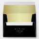 Simple, luxury, modern, chic gold glitter and black 5x7 envelope with return address and elegant calligraphy script.