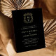 These simple and elegant wedding invitations feature a gold foil crest with your monogram or initials in the centre, and modern gold foil text on a dark, black background. A classy and modern look for your wedding celebration.