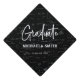 Simple math black and white graduation cap topper with a background of mathematical formulas and equations. Illustrated and designed by Patricia Alvarez.