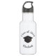 Personalized water bottle designed with a black graduation cap surrounded by a semi-transparent white circle. Class of 20xx and a name written in curved text. Modern and stylish.