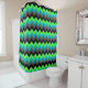 A shower curtain featuring an elegant pattern design of multicolored chevrons in black, grey, green and turquoise.