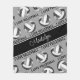 This cute volleyball themed fleece blanket for girls features the realistic image of a volleyball that has black, grey and white panels patterned at an angle with the sporty font text phrase "I love volleyball" in black that stretches between the angled rows of volleyballs - the volleyballs' black and grey panels are blended with a girly kaleidoscopic pattern for a textured appearance - personalize her name in a sophisticated handwritten font on an angled chunky full width black colour strip - background is customizable grey - by katz_d_zynes