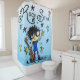 A cute shower curtain for your little rock star, features a gradient blue background with stars of yellow and dark blue, fancy text that reads Rock Star, and a black haired boy with a guitar.