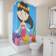 Pretty and cute shower curtain for girls who love the ocean and mermaids, features a cute black haired mermaid, coral, seaweed, seashells, and a starfish on a bright blue background.