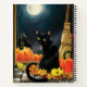 A black cat sits in a doorway with pumpkins, lantern, broomstick, autumn leaves and a full harvest moon in behind.