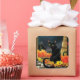 A black cat sits in a doorway with pumpkins, lantern, broomstick, autumn leaves and a full harvest moon in behind.