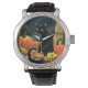 A black cat in a doorway with pumpkins, broomstick, autumn leaves and a full moon
