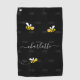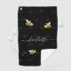 Decorated with happy, smiling yellow and black bumble bees. A chic black background. Personalize and add a name and your monogram, initials. The monogram in grey as a pattern in the background. The name is written in white with a modern hand lettered stylie script with swashes. To keep the swashes only delete the sample name, leave the spaces or emoji's in front and after the name.
