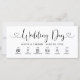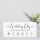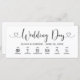 Modern black and white wedding day timeline cards feature a stylish typography design with wedding day event icons, timing information, chic calligraphy script, and heart accents. The simple and elegant custom text that can be completely personalized with the bride and groom names, wedding date. and timeline details.