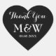 Black heart shaped wedding favour thank you stickers. Black and white or custom background colour. Elegant script typography. Use as romantic envelope seals / sealers or as wedding favour label for thanking guests. Cute love symbol shape with stylish text. Also handy for other occasions like engagement party, anniversary etc.
