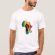 The design features a silhouette of the African continent filled with the colours of the Pan-African flag, prominently displaying a raised black fist symbolizing strength and unity.