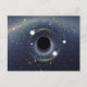 Simulated view of a black hole in front of the Large Magellanic Cloud. The ratio between the black hole Schwarzschild radius and the observer distance to it is 1:9. Of note is the gravitational lensing effect known as an Einstein ring, which produces a set of two fairly bright and large but highly distorted images of the Cloud as compared to its actual angular size.