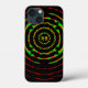 A pulsating, radiating geometric graphic design with a black hole sun theme and a red, green and black colour palette. It is captioned with monogrammed text and is a fully editable template.