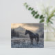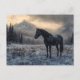 A striking black horse stands majestically in a serene snowy landscape, its dark coat contrasting beautifully against the crisp white snow. The tranquil, wintry scene captures the beauty of nature's stillness, with delicate snowflakes drifting gently around the horse.