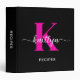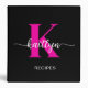 This simple, elegant black 2" capacity recipe 3 ring binder with your first name in a trendy script font in white and your first initial in a modern cap font in hot pink is perfect for keeping your recipes neat and tidy. It's stylish and trendy and yet very classic.